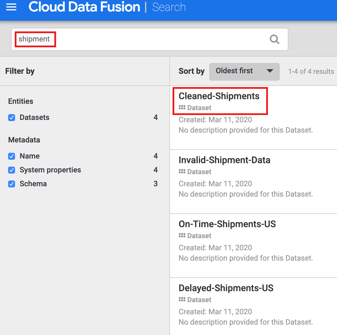 You must discover a dataset before exploring its lineage. Select Metadata from the Cloud Data Fusion UI left navigation panel to open the metadata Search page. Since the Shipment Data Cleansing dataset specified Cleaned-Shipments as the reference dataset, insert shipment in the Search box. The search results include this dataset.