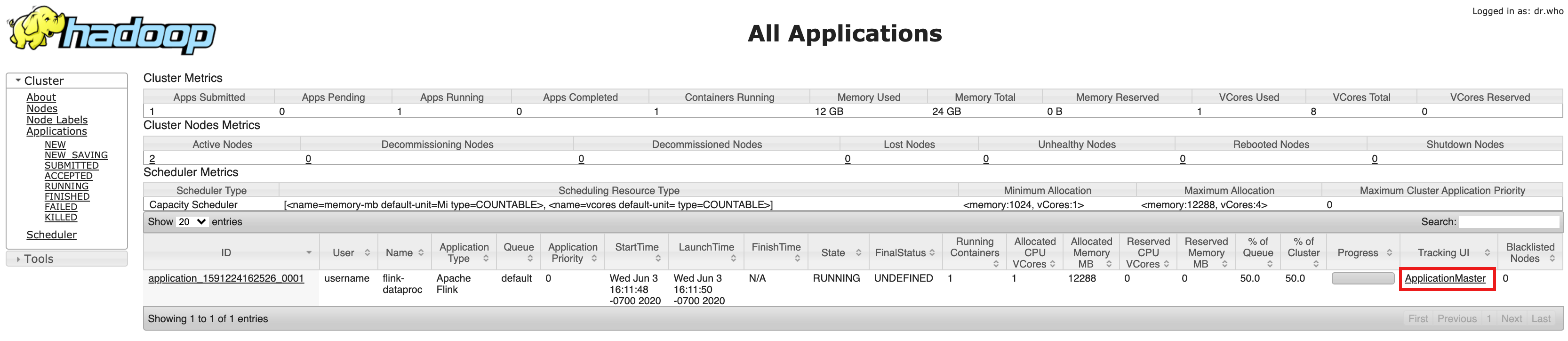 - On the YARN Resource Manager UI, identify the Flink cluster application
