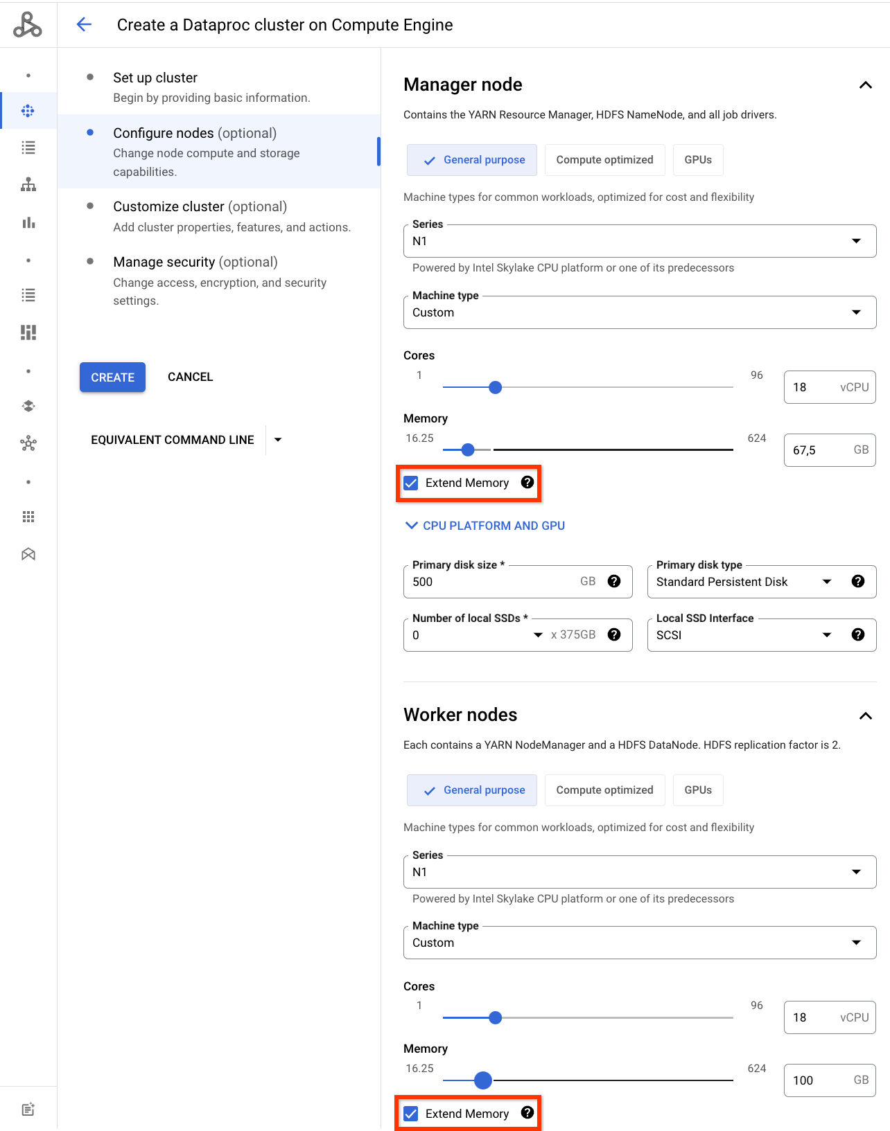 gcloud dataproc clusters create test-cluster / --master-machine-type custom-1-51200-ext / --worker-machine-type custom-1-51200-ext / other args