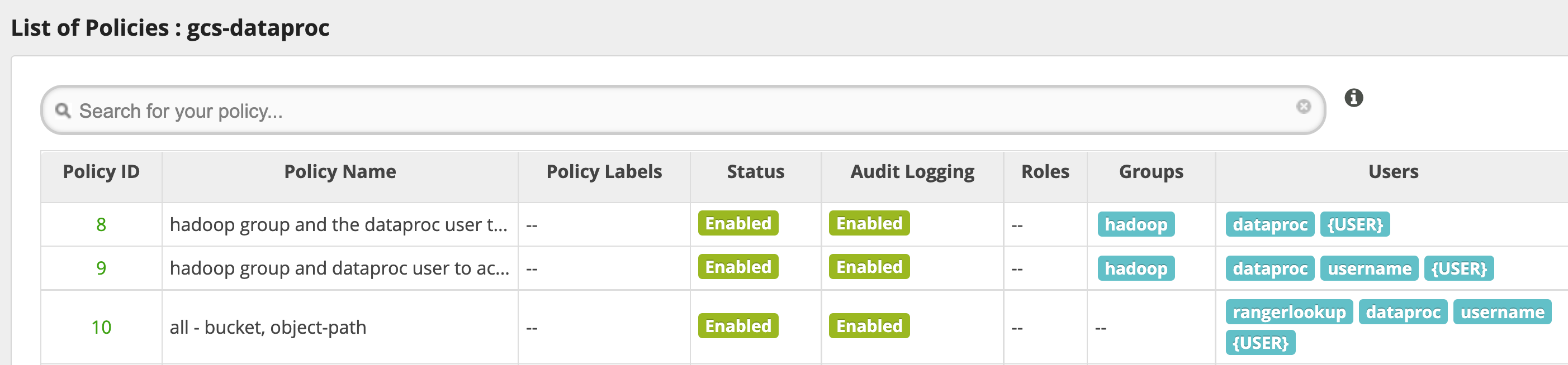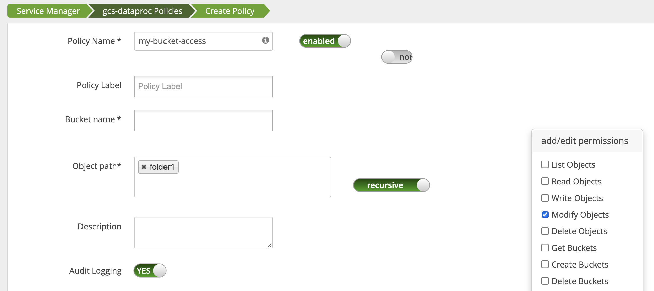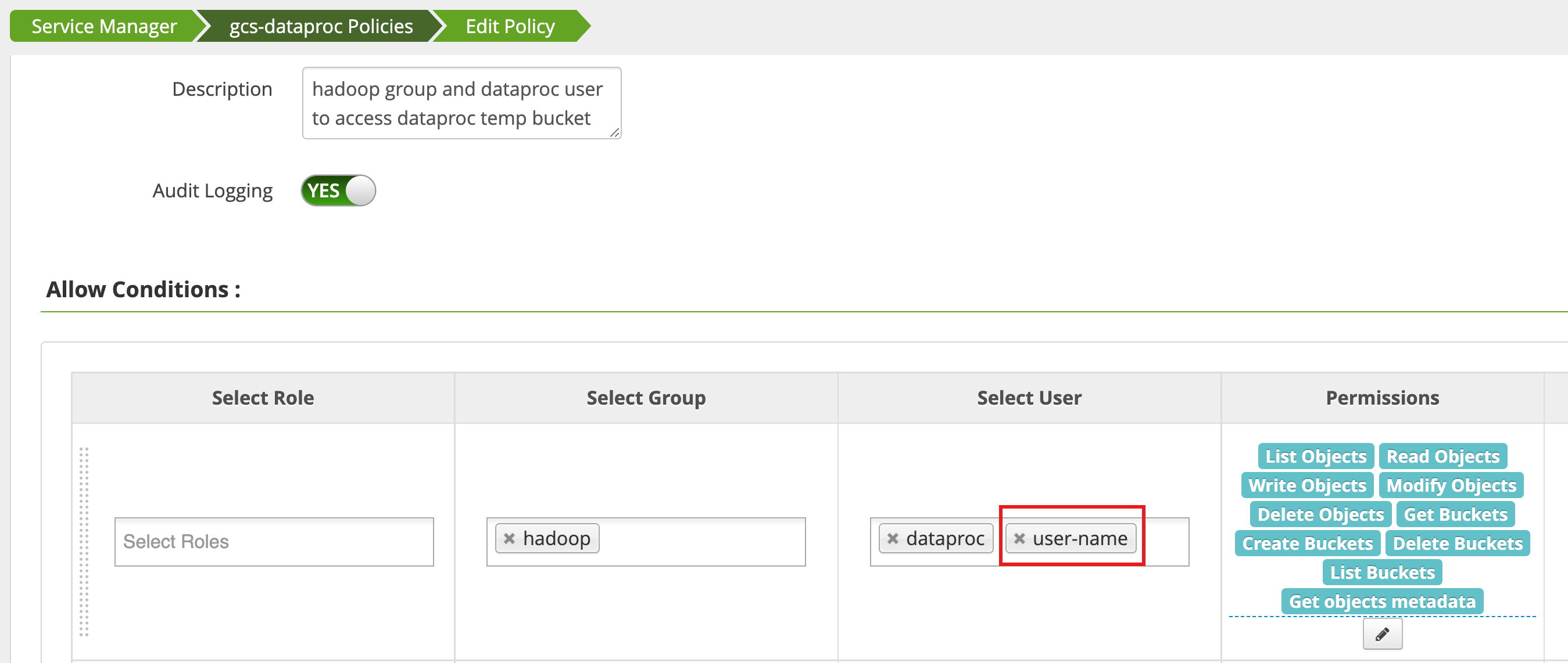 all - bucket, object-pathpolicy, which allows all users to access metadata for all objects. This access is required to allow the Cloud Storage connector to perform HCFS (Hadoop Compatible Filesystem) operations.
