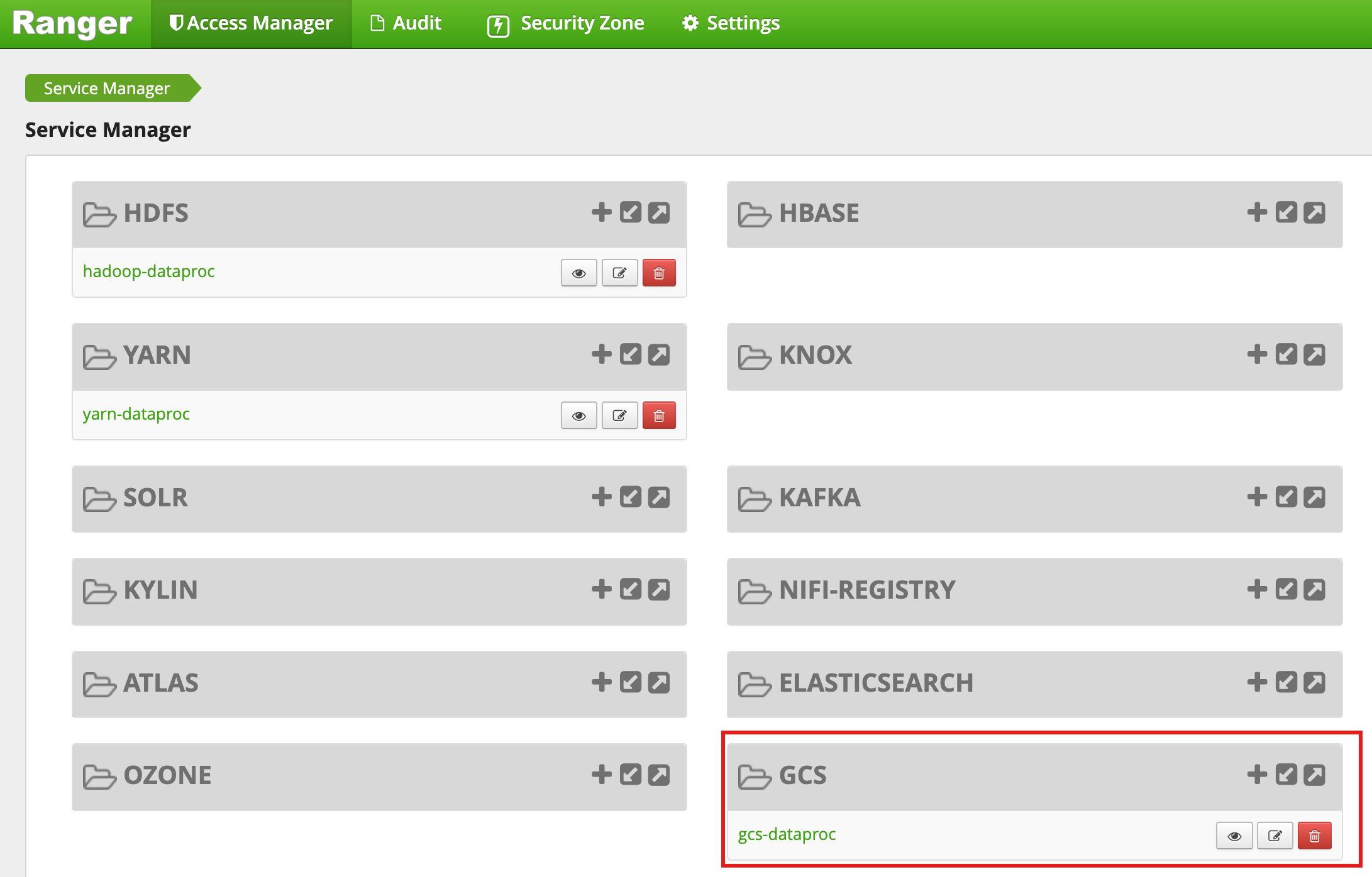 After the cluster creation completes, a GCS service type, namedgcs-dataproc,