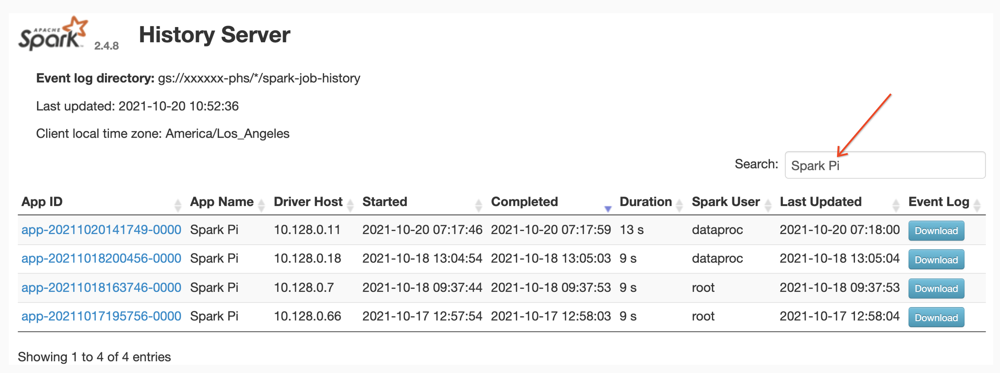 Spark History Server web interface