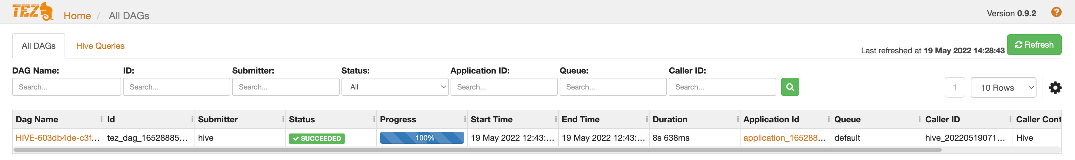 Tez is the default execution engine for Hive and Pig on Managed Service for Apache Spark. Submitting a Hive job on a Managed Service for Apache Spark job cluster launches a Tez application.
