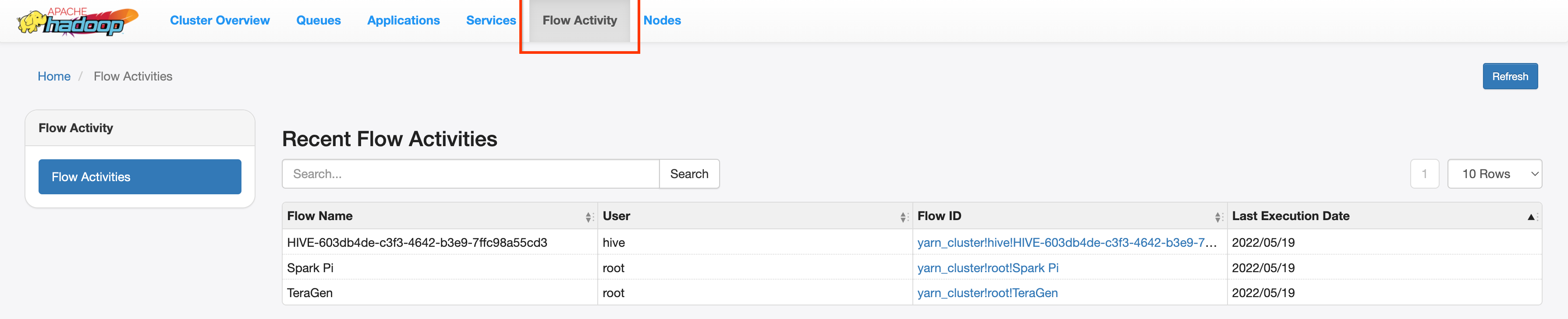 PHS server. Managed Service for Apache Spark jobs are listed under the Flow Activity