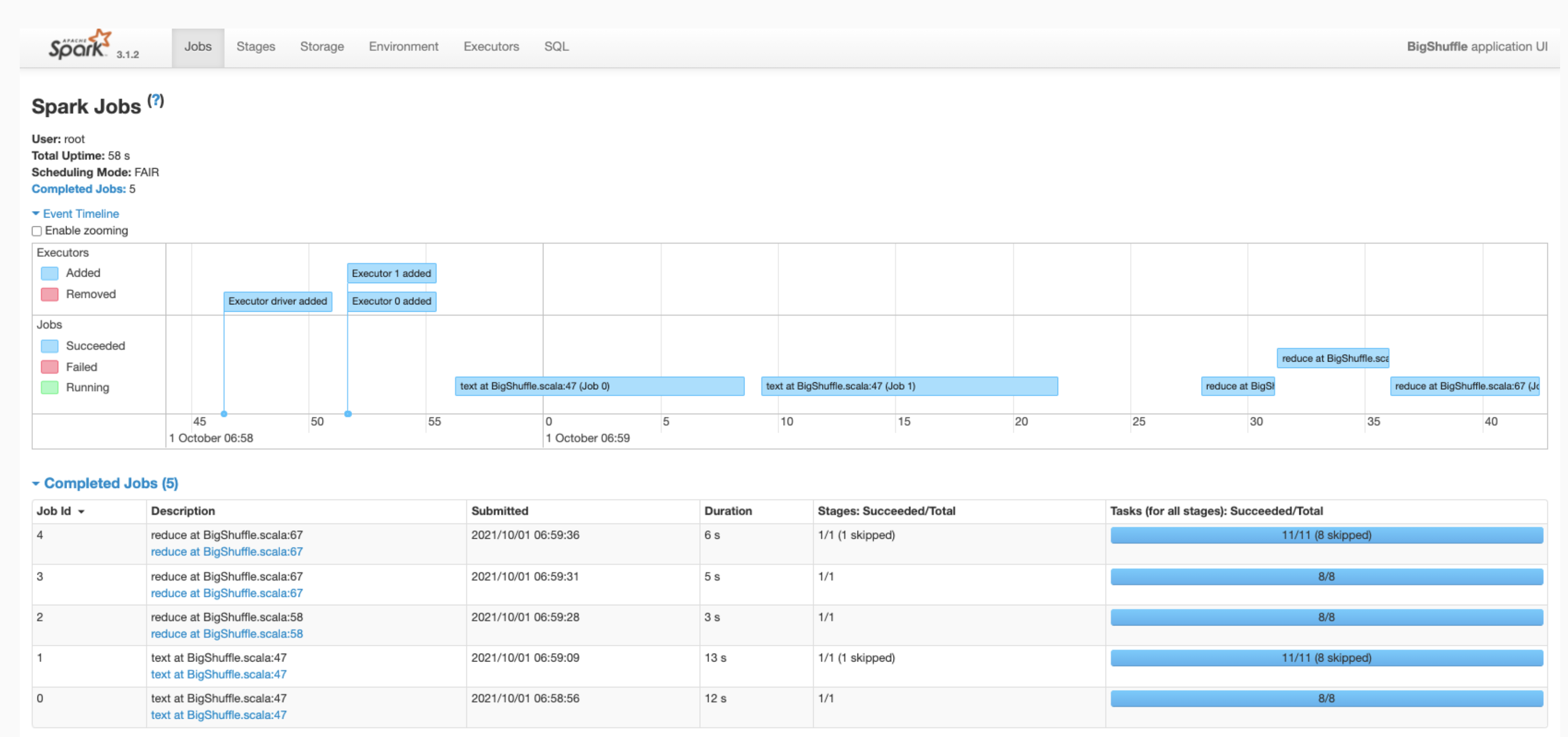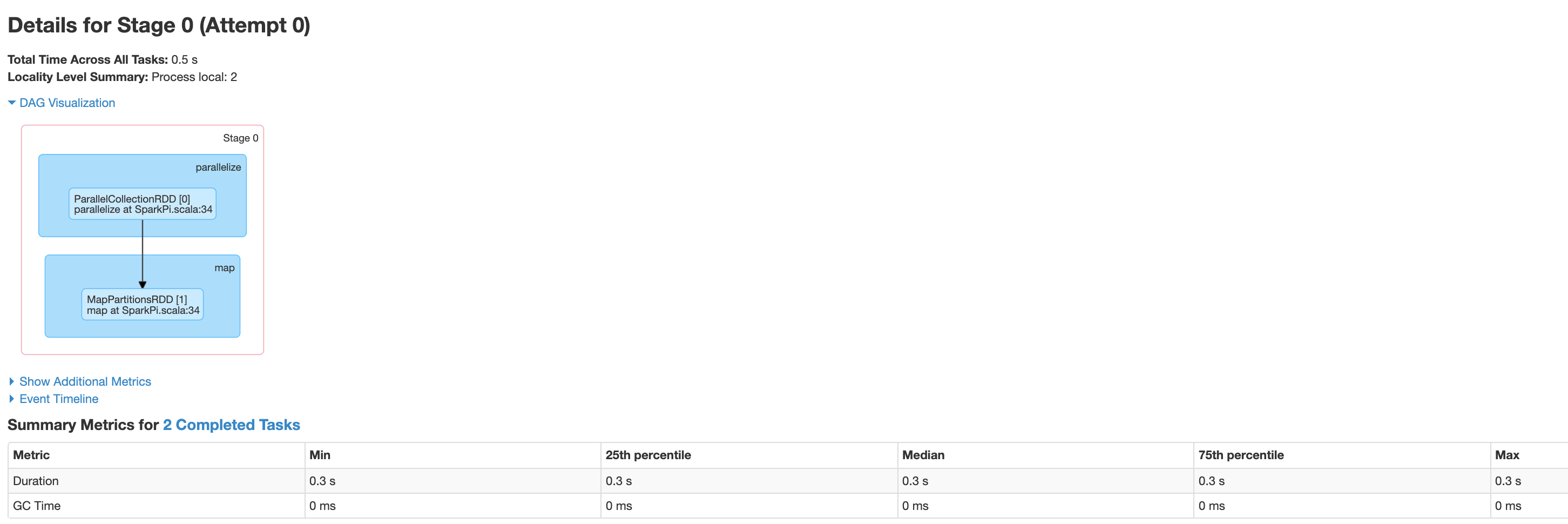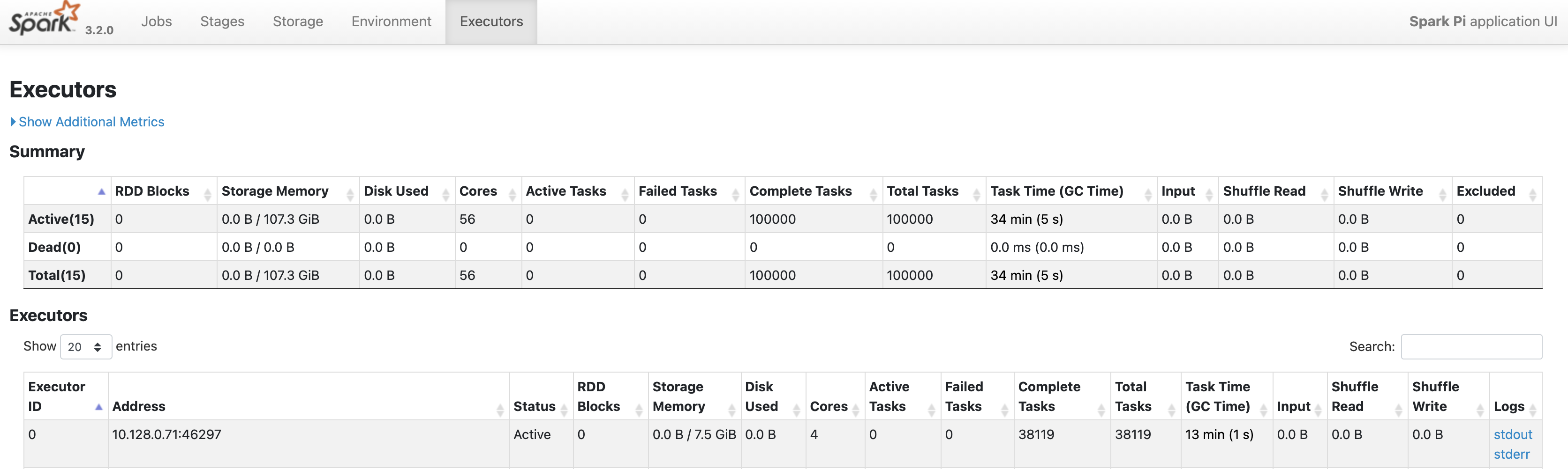 Important pieces of information on this page include the number of cores and the number of tasks that were run on each executor.