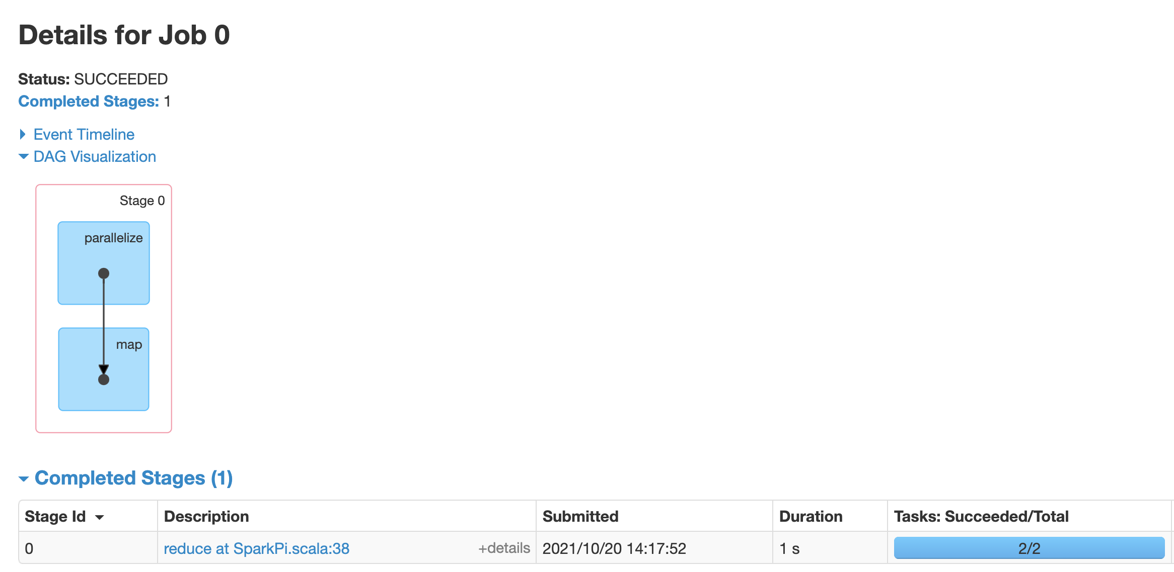 Click a job to open a Job Details page with a Directed Acyclic Graph (DAG) and summary of job stages.
