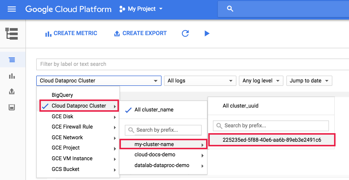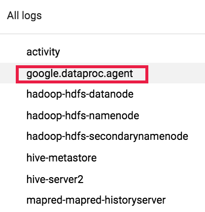To view the dataproc agent log in Logging, select Managed Service for Apache Spark Cluster→Cluster Name→Cluster UUID from the Logs Explorer cluster selector.