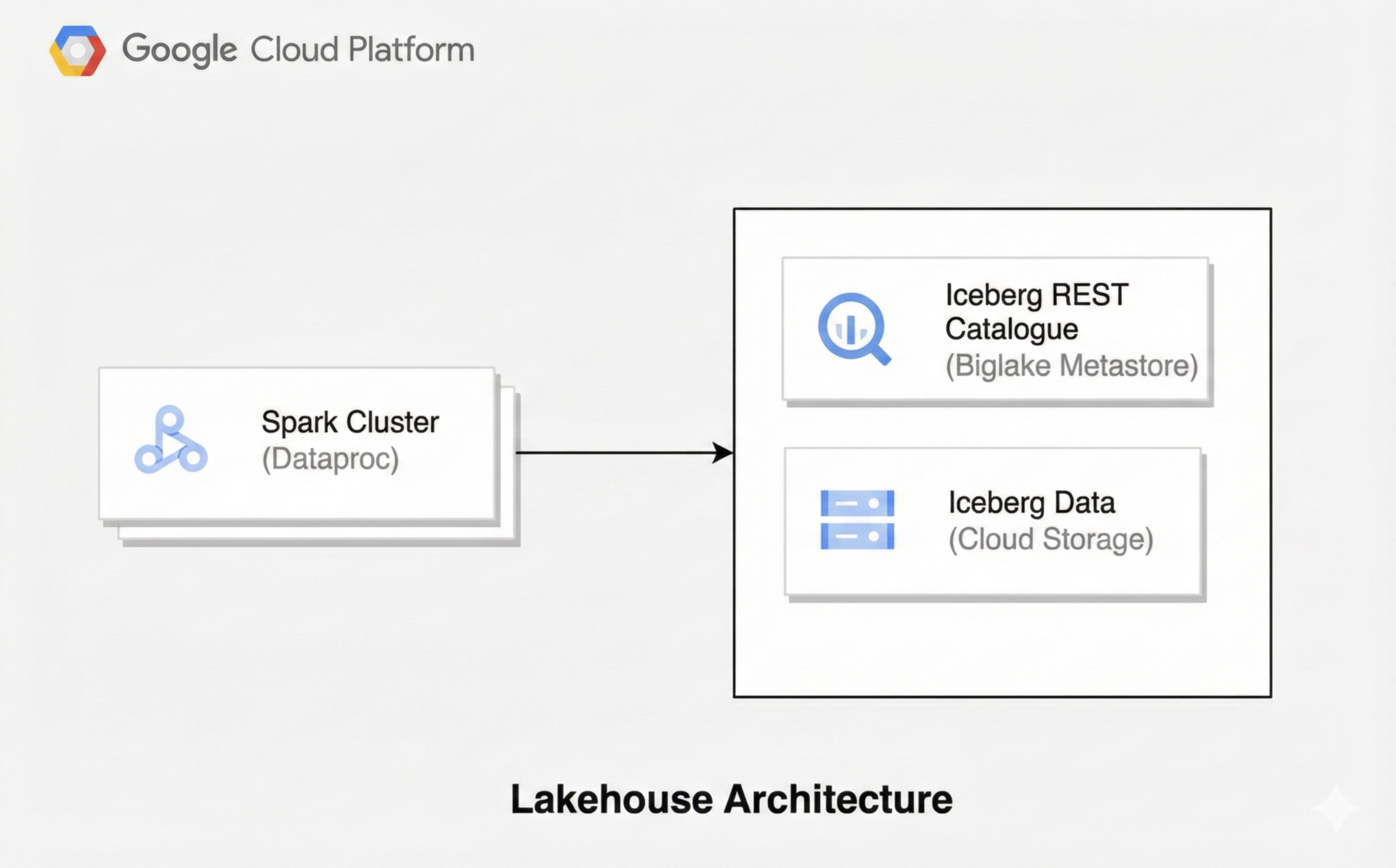 A lakehouse architecture combines the flexibility of a data lake with the data management features of a data warehouse. This document shows you how to set up a lakehouse on Google Cloud. You use Apache Iceberg as the table format, Apache Spark on Managed Service for Apache Spark for processing, and the BigQuery Iceberg REST Catalog for unified metadata management.