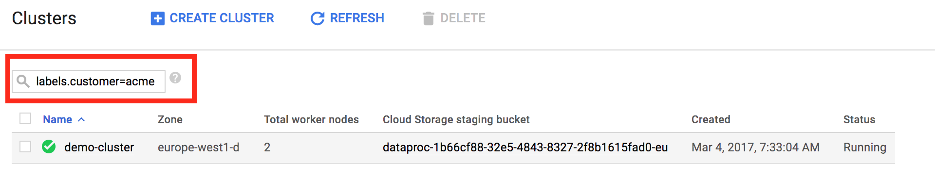 gcloud dataproc clusters list \ --region=region \ --filter="status.state=ACTIVE AND labels.environment=production"gcloud dataproc jobs list \ --region=region \ --filter="status.state=ACTIVE AND labels.customer=acme"