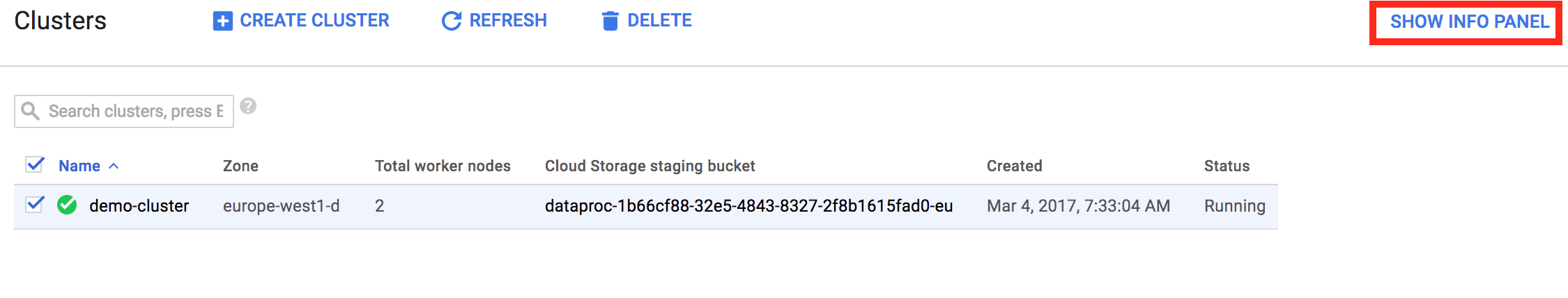 click the selection box for a listed cluster or job, then click SHOW INFO PANEL. This is an example from the Managed Service for Apache Spark→List clusters page.