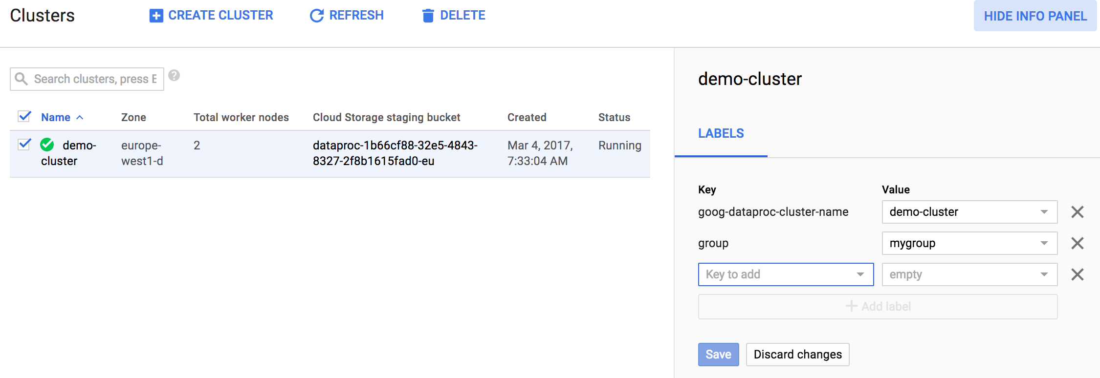 Once the info panel is displayed, you can update the labels for your Managed Service for Apache Spark cluster or job. The following is an example of updating labels for a Managed Service for Apache Spark cluster.