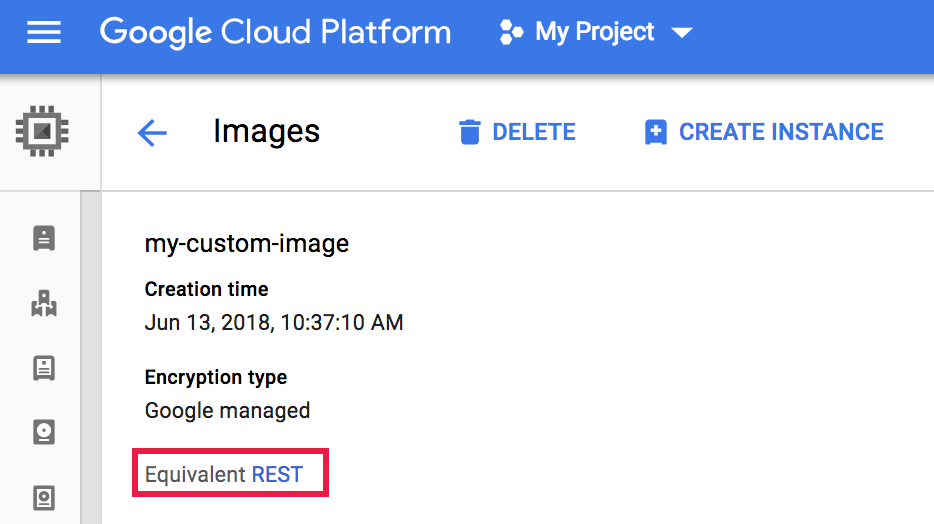 selfLink, which is the image URI.{ ... "name": "my-custom-image", "selfLink": "projects/PROJECT_ID/global/images/CUSTOM_IMAGE_NAME", "sourceDisk": ..., ... }