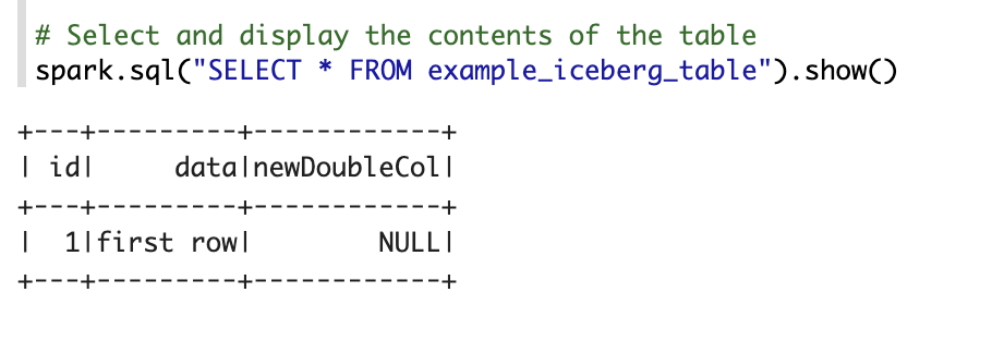 spark.sql("ALTER TABLE example_iceberg_table ADD COLUMNS (newDoubleCol double);") \#Selectanddisplaythecontentsofthetable.