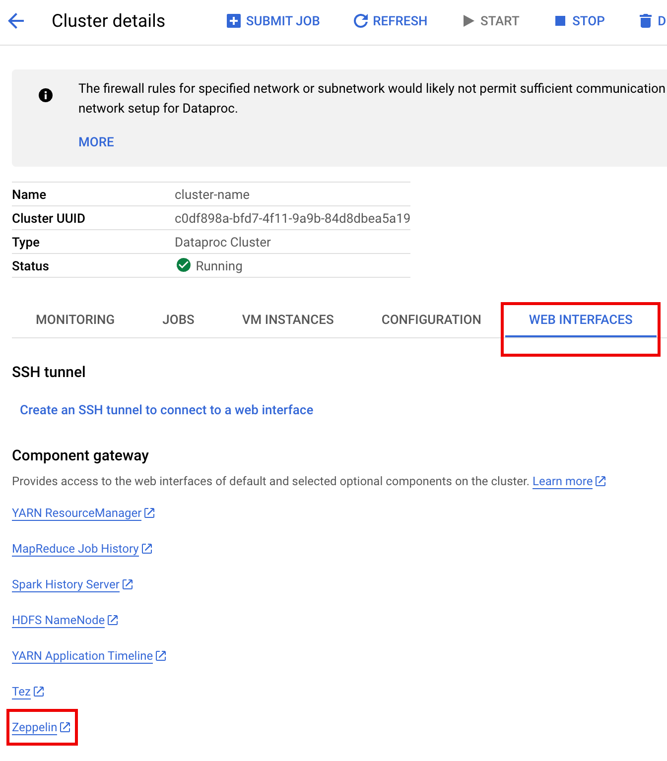 Click the Zeppelin link to open the Zeppelin web interface.