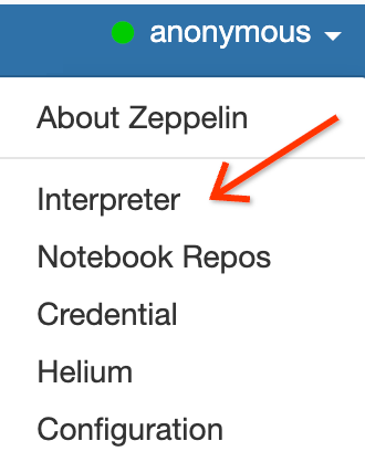 In the Zeppelin web interface, click the anonymous menu, then click