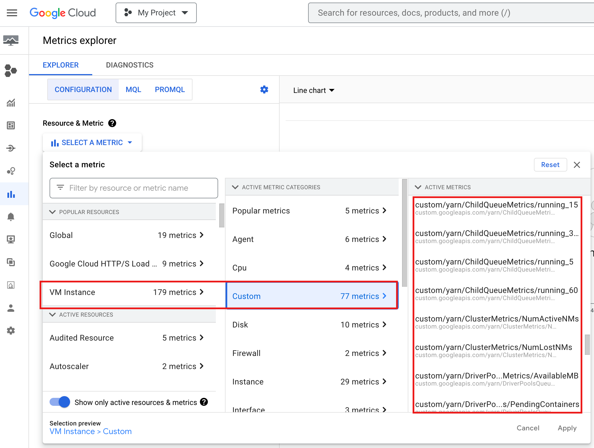 Select VM Instance → Custom resources in the Metrics Explorer.
