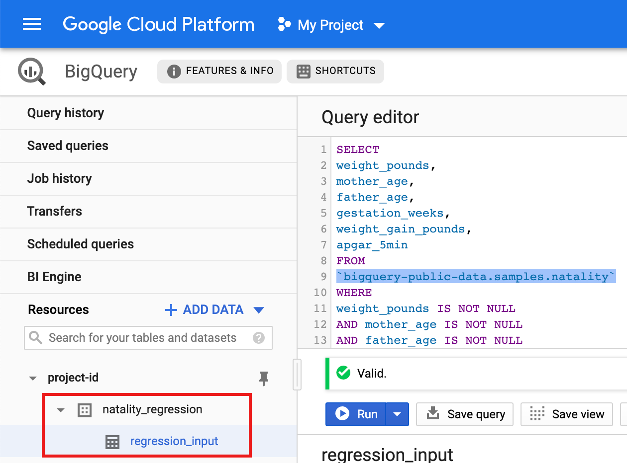natality_tutorial.pycode, below, into apythonshell on your local machine. Press the<return>key in the shell to run the code to create a "natality_regression" BigQuery dataset in your default Google Cloud project with a "regression_input" table that is populated with a subset of the publicnatalitydata.Confirm the creation of the