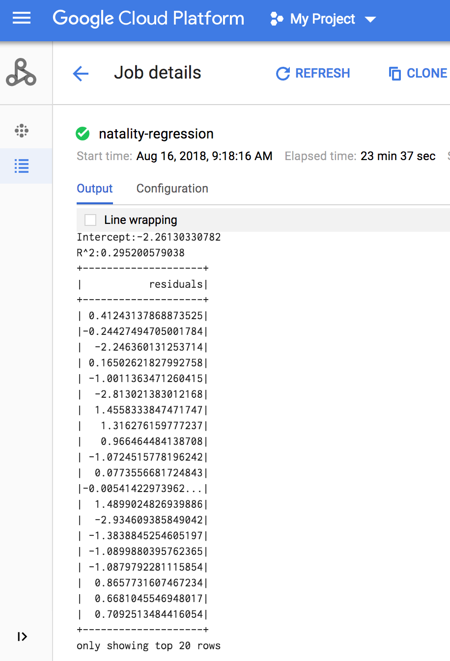 <<< # Print the model summary. ... print "Coefficients:" + str(model.coefficients) Coefficients:[0.0166657454602,-0.00296751984046,0.235714392936,0.00213002070133,-0.00048577251587] <<< print "Intercept:" + str(model.intercept) Intercept:-2.26130330748 <<< print "R^2:" + str(model.summary.r2) R^2:0.295200579035 <<< model.summary.residuals.show() +--------------------+ | residuals| +--------------------+ | -0.7234737533344147| | -0.985466980630501| | -0.6669710598385468| | 1.4162434829714794| |-0.09373154375186754| |-0.15461747949235072| | 0.32659061654192545| | 1.5053877697929803| | -0.640142797263989| | 1.229530260294963| |-0.03776160295256...| | -0.5160734239126814| | -1.5165972740062887| | 1.3269085258245008| | 1.7604670124710626| | 1.2348130901905972| | 2.318660276655887| | 1.0936947030883175| | 1.0169768511417363| | -1.7744915698181583| +--------------------+ only showing top 20 rows.