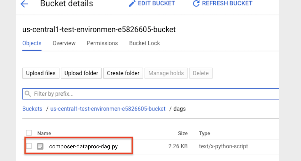 4. Upload your DAG to your environment folder in Cloud Storage. After the upload has been completed successfully, click the DAGs Folder link on the Cloud Composer Environment's page.