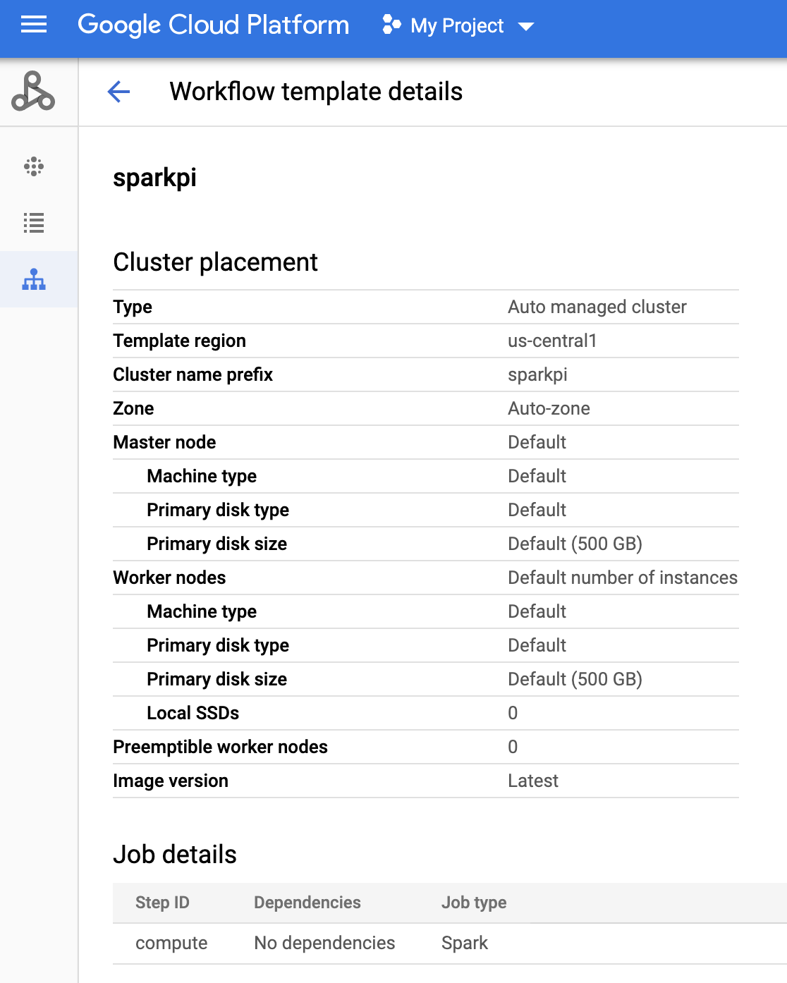 Click the sparkpi name on the Managed Service for Apache Spark Workflows page in the Google Cloud console to open the Workflow template details page. Click the name of your workflow template to confirm the sparkpi template attributes.