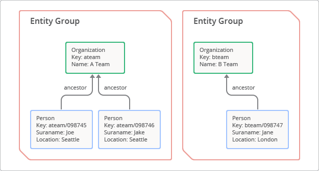 [1] An entity group can even be formed by specifying only one key of the root or parent entity, without storing the actual entities for the root or parent, because the entity group functions are all implemented based on relationships between keys.