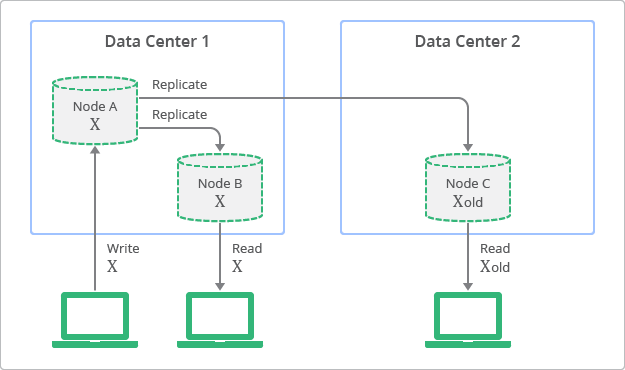 Figure 1 illustrates the concept of replication with eventual consistency. The diagram illustrates that although replicas are always available to read, some replicas may be inconsistent with the latest write on the originating node, at a particular moment in time. In the diagram, Node A is the originating node and nodes B and C are the replicas.