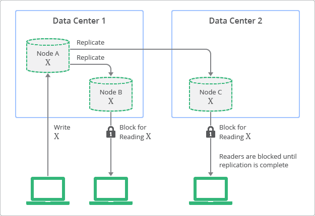 A conceptual view of the deployment topology and replication process with strong consistency is shown in Figure 2. In this diagram, you can see how replicas always have values consistent with the originating node, but are not accessible until the update finishes.