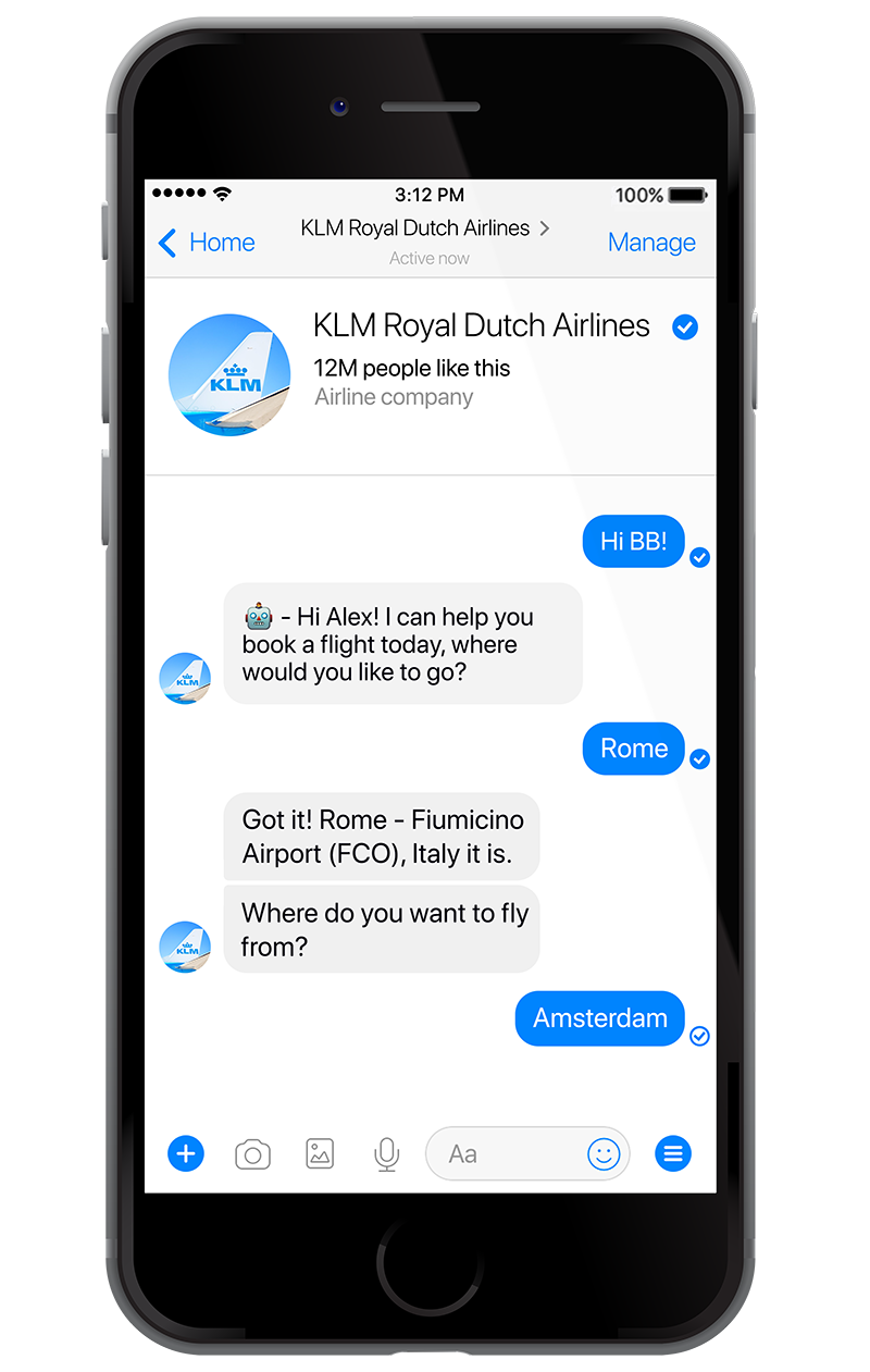 The airline's first project was a booking bot for Facebook Messenger, which they introduced in September 2017. KLM dubbed it ‘BB,' for Blue Bot (blue being their signature color). BB's personality is female, helpful, friendly, and professional. She's also a bit edgy, and occasionally even cracks a joke. "If you want to make a booking through Messenger, BB will ask you for your destination, when you want to fly, etc.," van der Lee explains. "We'll show you the options, and you can purchase, fill out your personal details, and get your booking confirmation, all right there on the conversational app." By connecting BB with KLM's CRM system, a human agent can easily take over if she is unable to answer.