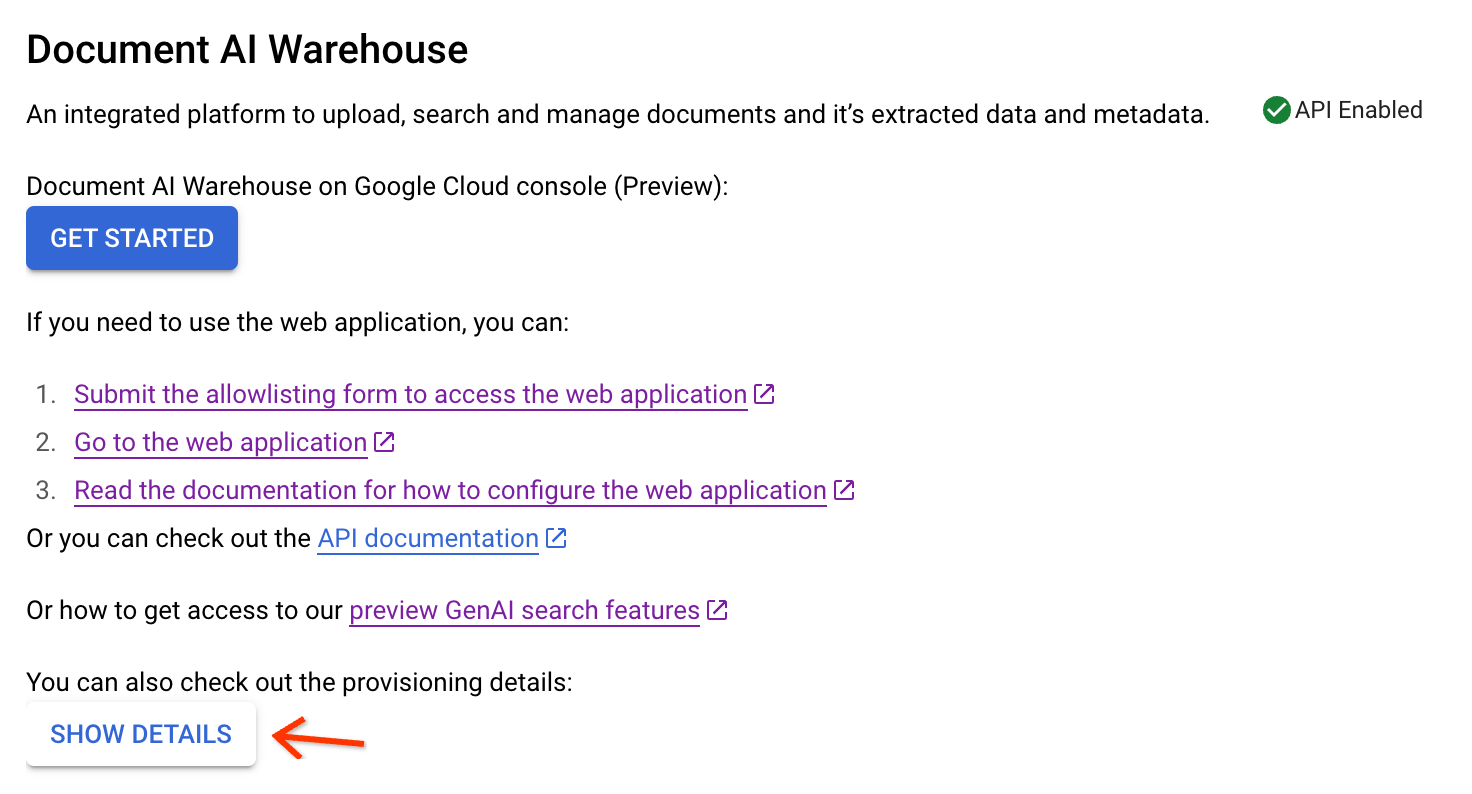 1. In the Document AI Warehouse settings view, which is the final view after provisioning, click Show Details.