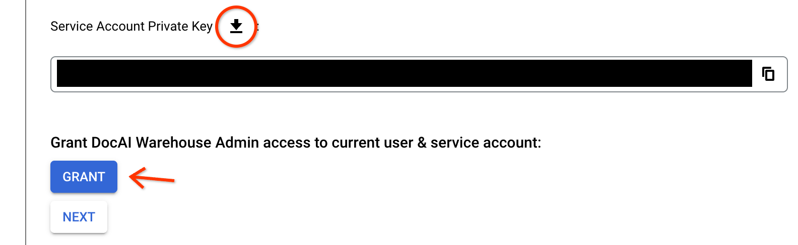 3. You can click the download button to save the key credentials. Then click Grant to grant your account and the service account the Content Warehouse Admin role.
