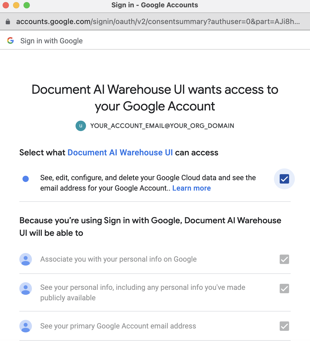 5. Give Document AI Warehouse access to your Google Cloud data by checking the first checkbox.