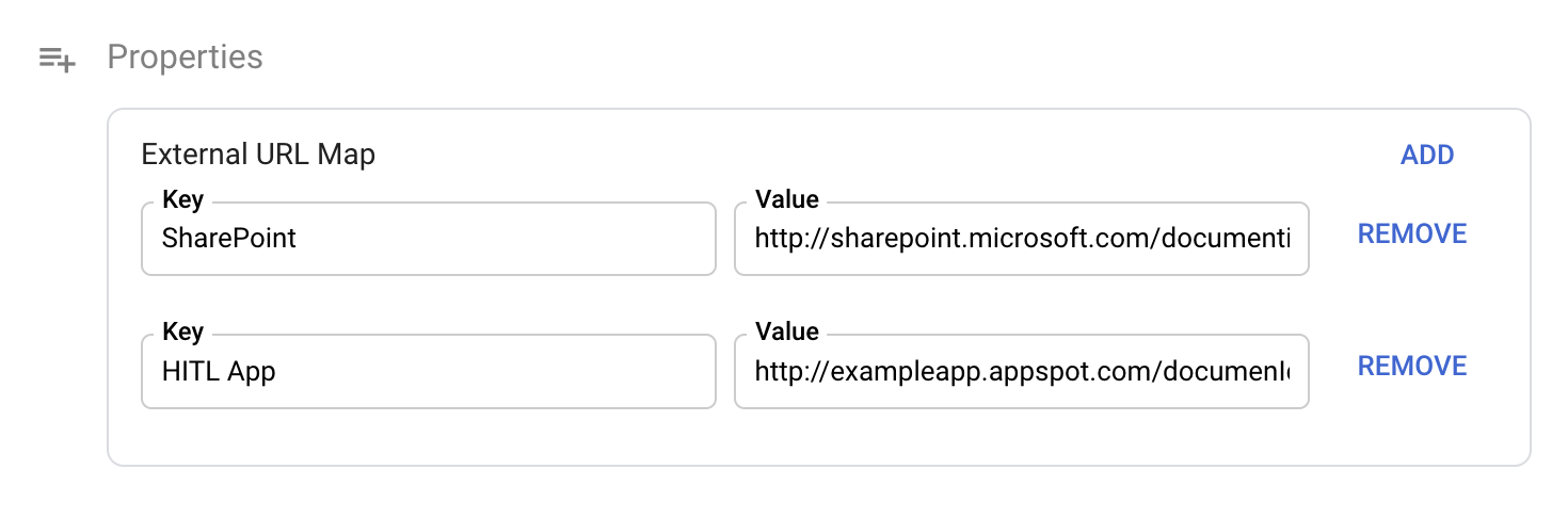 { "name": "defaultViewerUrl", "display_name": "Default Viewer URL", "is_repeatable": false, "is_filterable": true, "is_searchable": true, "is_metadata": true, "is_required": false, "text_type_options": {}, "schema_sources": [] }External app URL: When viewers use different applications for viewing documents, this is a map property. For example, a HITL labeler might open the HITL app to correct entities, but a business user opens the Sharepoint app to review the document.