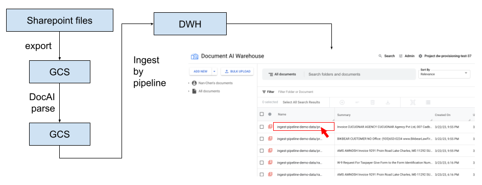 - First, you need a way to ingest Document AI parsed documents in JSON format to Document AI Warehouse.