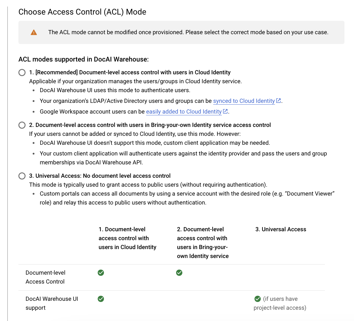 4. Select an access control (ACL) mode and enable GenAI. When choosing ACL mode, you can select either: