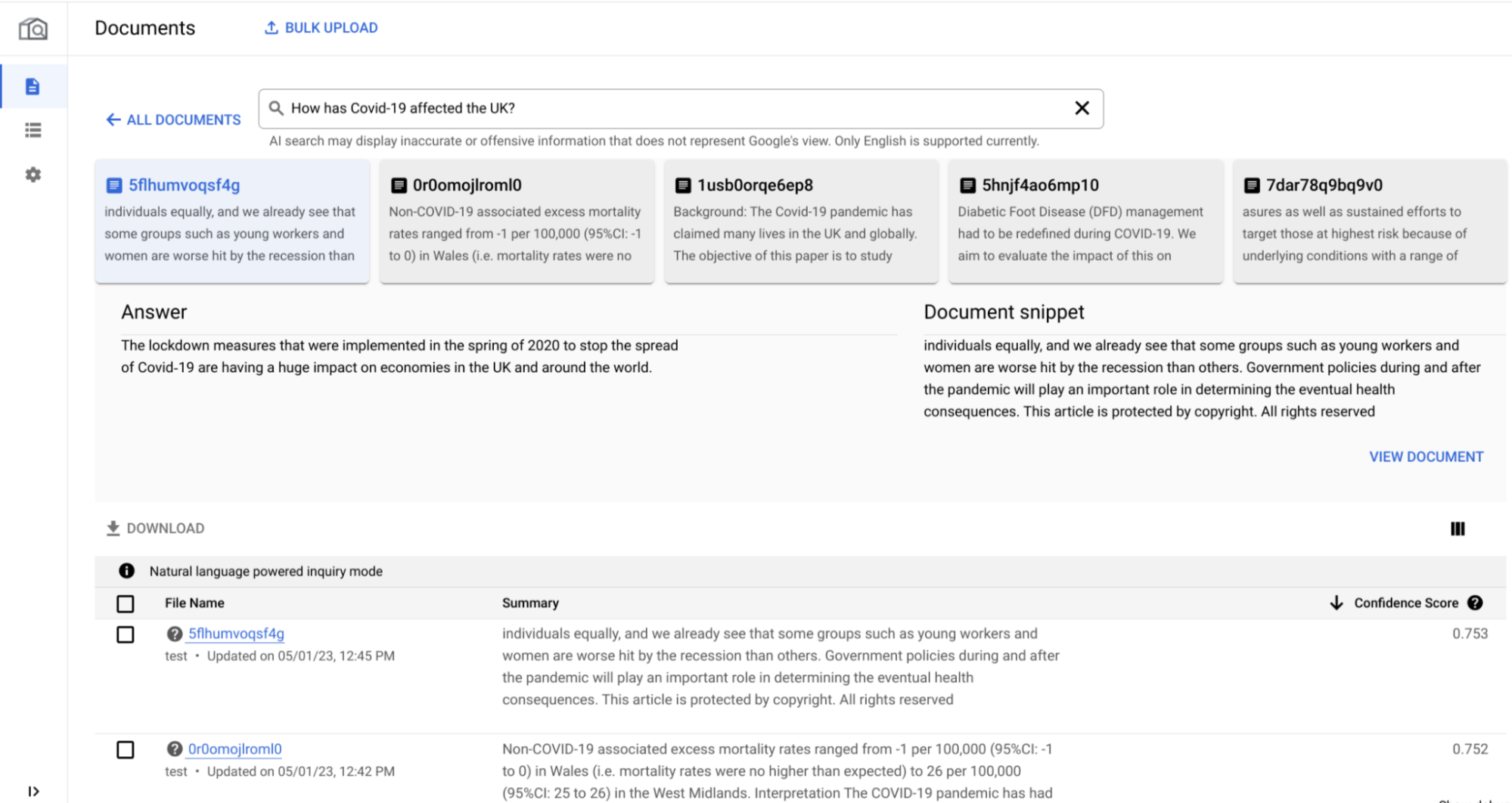• The top five documents are listed in the generative AI section, which is populated with additional information in the table section.