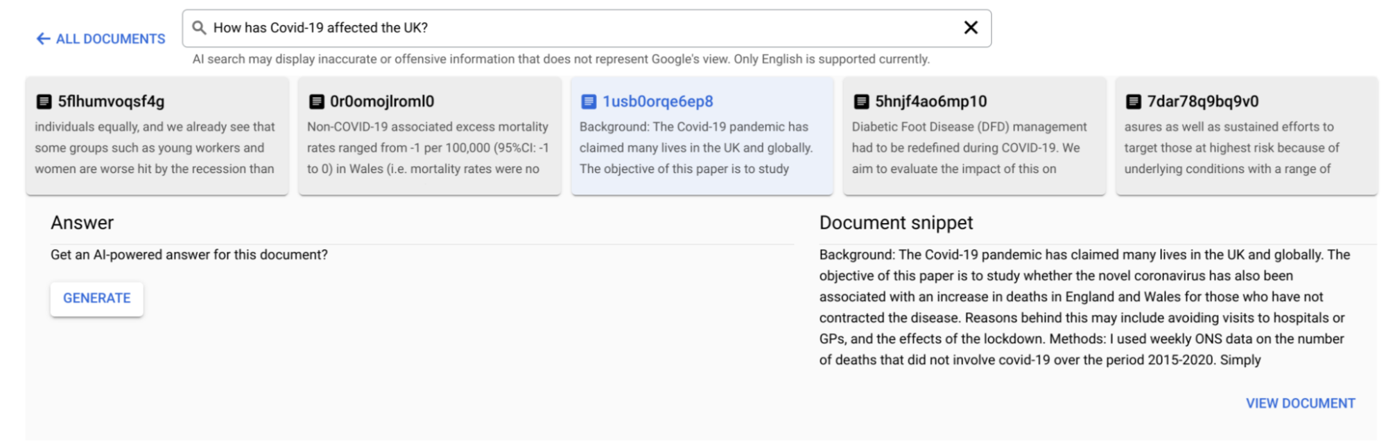 • On the documents page, enter your natural language question in the generative AI search box.