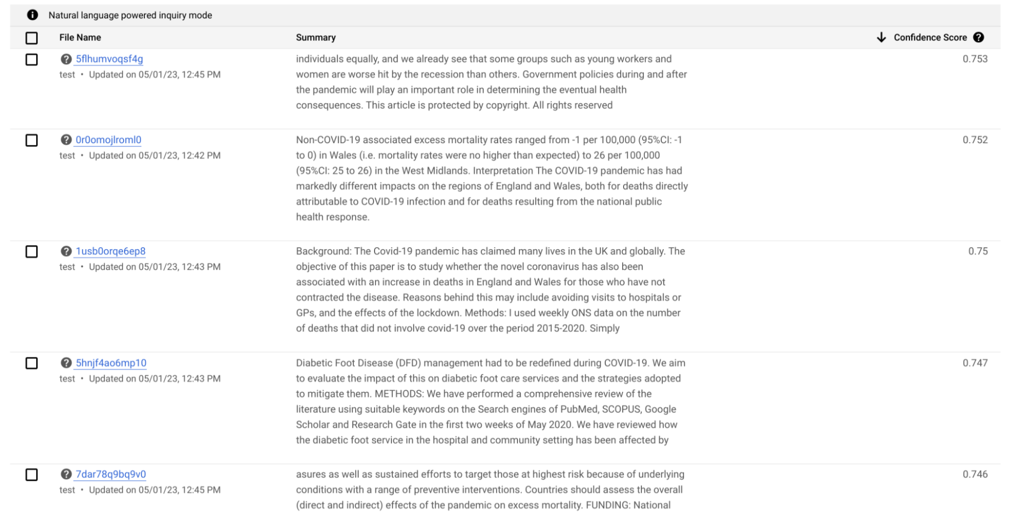 • The Confidence Score column is a metric from 0 to 1, with higher scores indicating greater relevance to a search query.