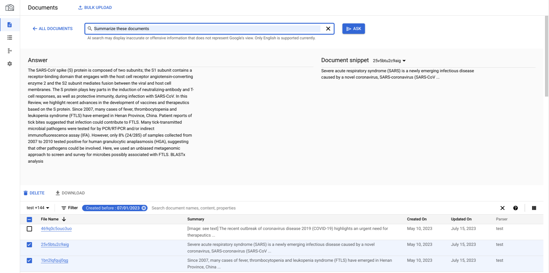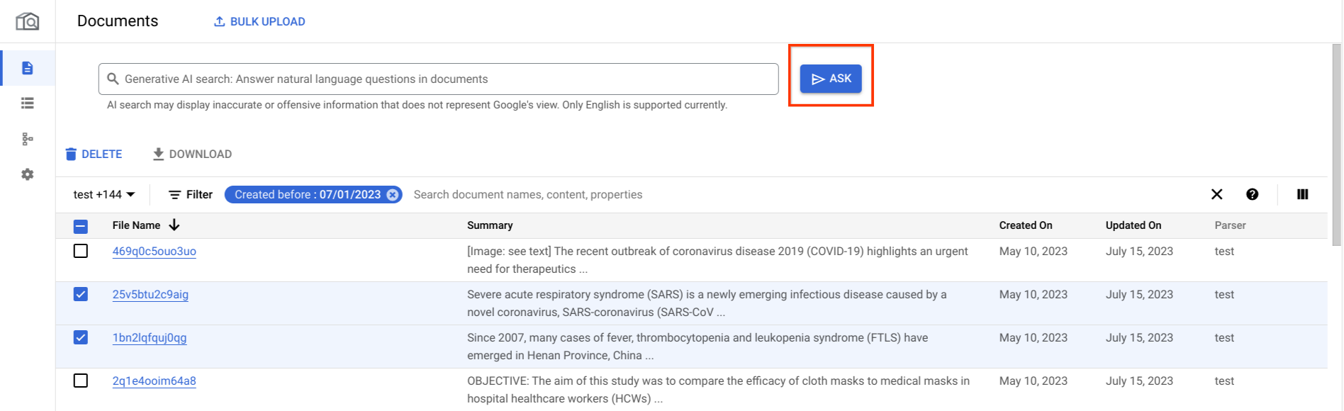 1. On the documents page, select documents on the table for which you want to ask questions. The Search option now appears as Ask to indicate that you enter the Q&A mode.