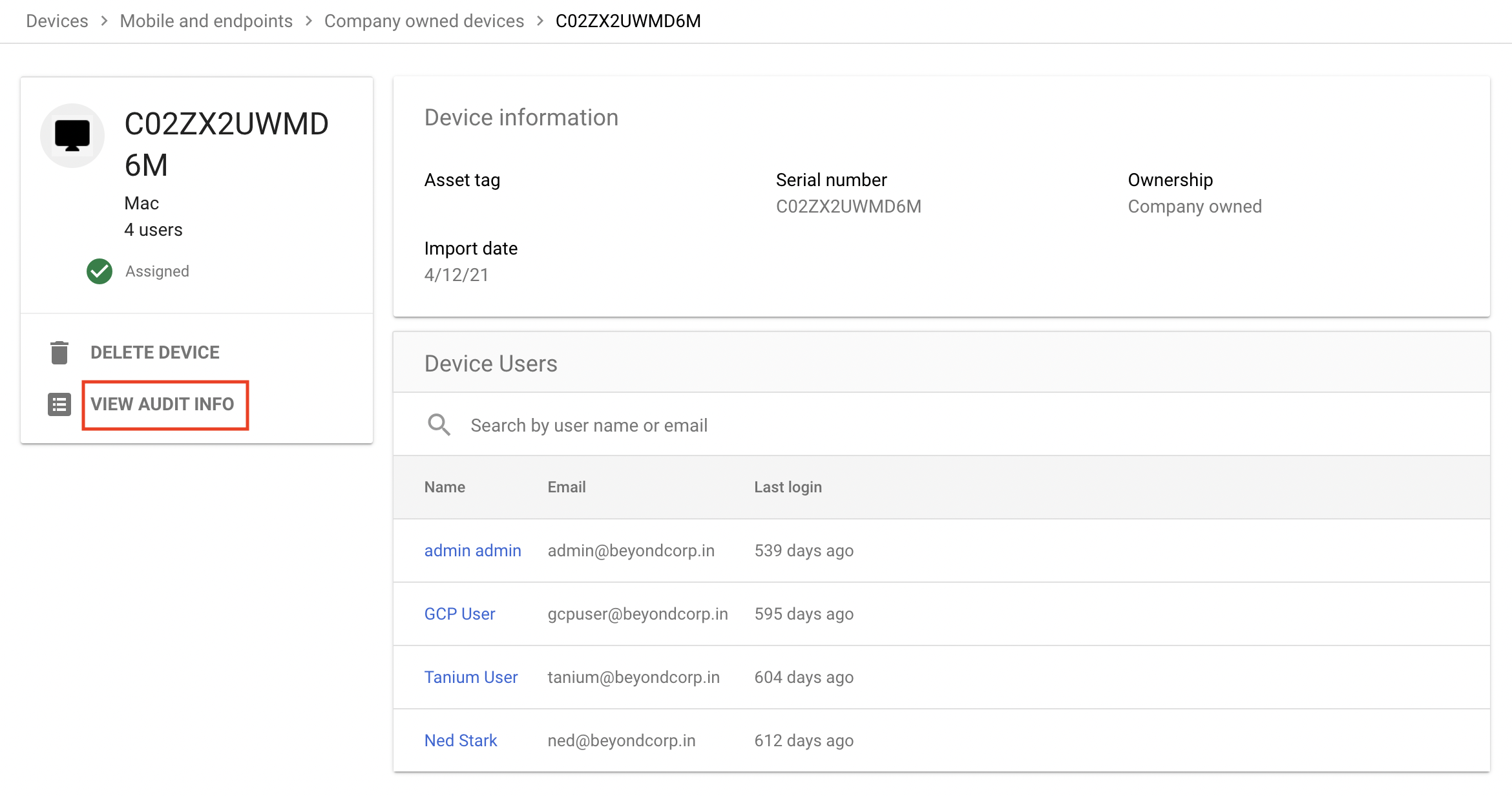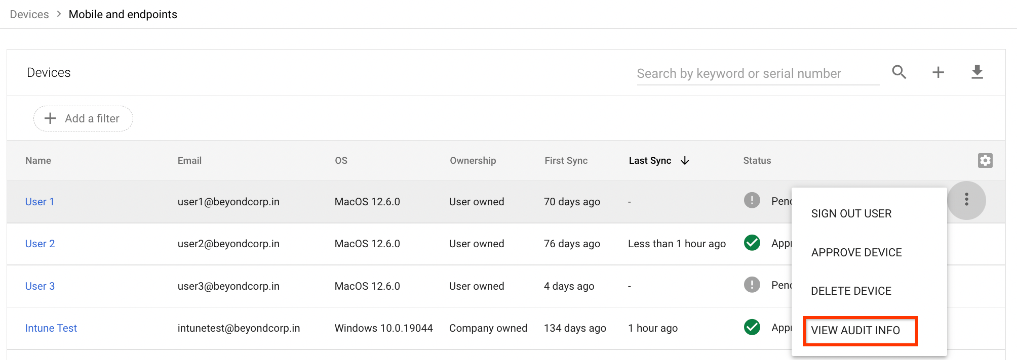 To get a report of activities on a device, click More and then select View audit info.
