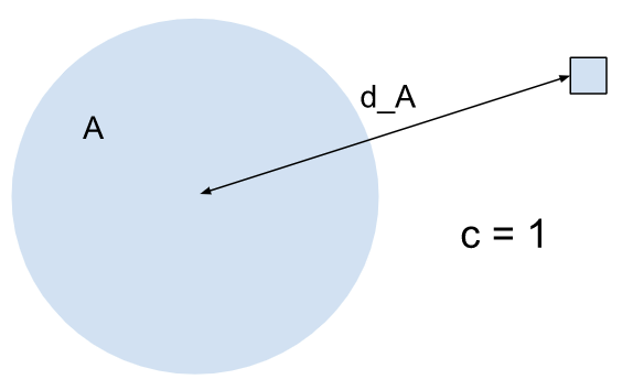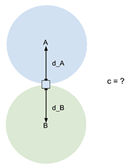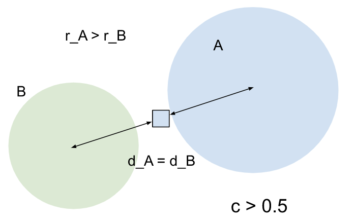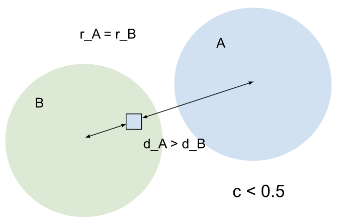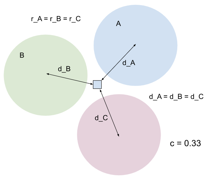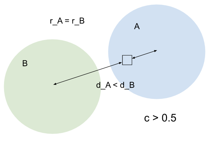 A has a larger spread than B, but their centroids are equally distant from the entity. A has a higher influence on the entity. Because the entity is also assigned to A, the confidence score will be larger than 0.5. |