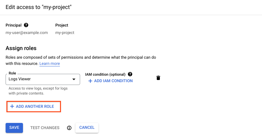 my-user@example.com.From the Select a role drop-down menu, search for Logs Viewer, then click Logs Viewer.
