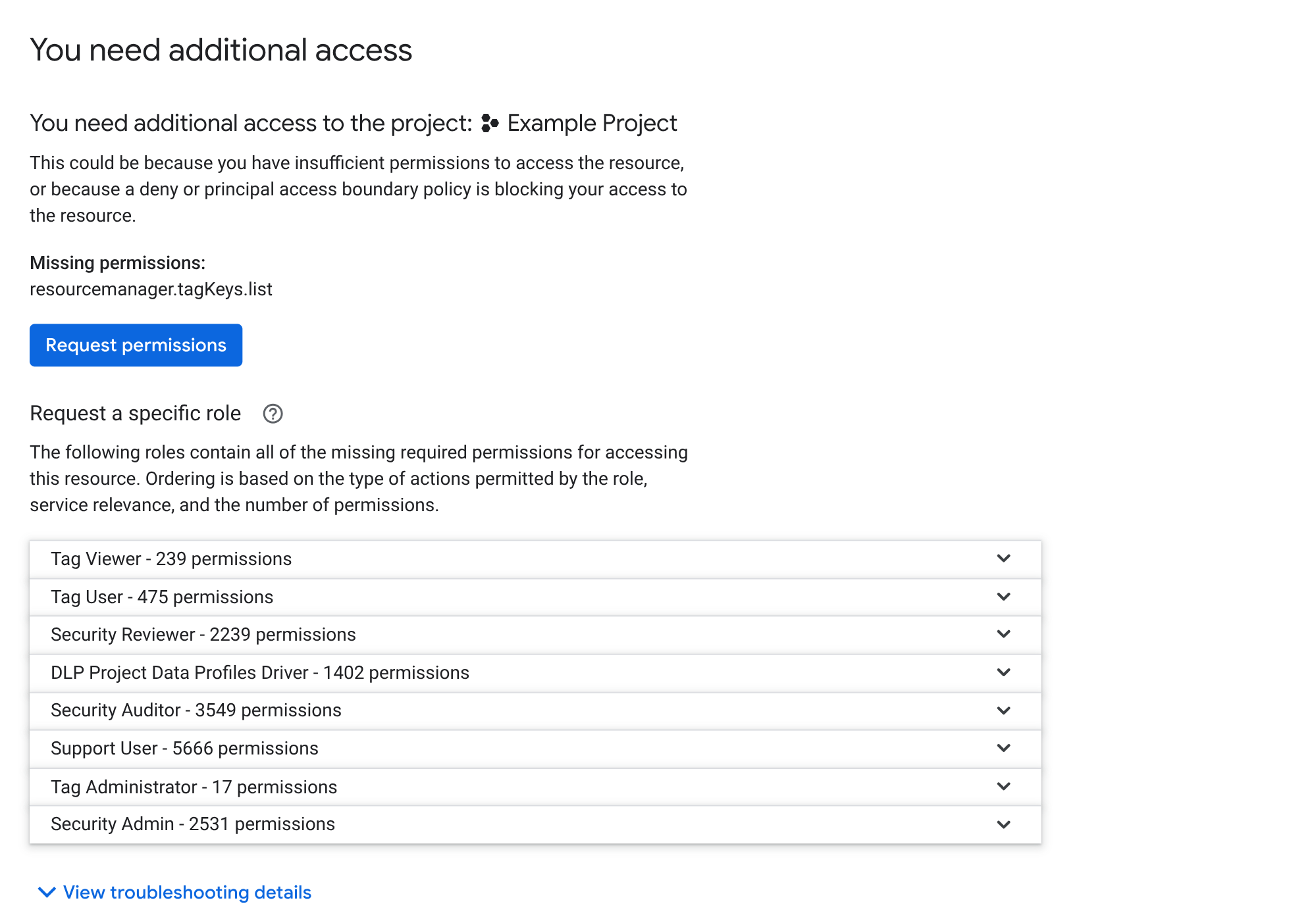 - The missing required permissions: A list of the permissions that you need to have to access the resource.