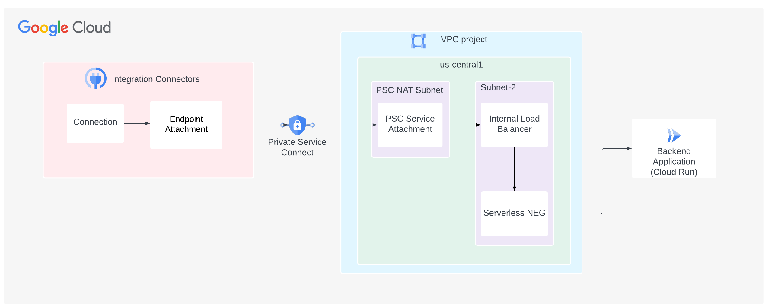 - All your Google Cloud components such as the PSC service attachment and the load balancer must be in the same region.