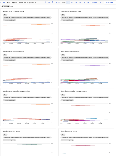 Select Resources > Dashboards and view the dashboard named GKE on-prem control plane uptime. The control plane uptime of each user cluster is collected from separate namespaces within the admin cluster. The namespace_name field is the user cluster name.