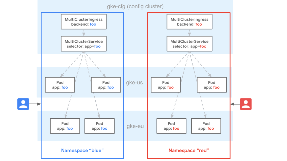 gke-eu and gke-us GKE clusters. Namespace sameness considers