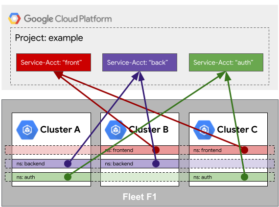 With fleet Workload Identity Federation, services within a fleet can leverage a common identity as they egress to access external resources such as Google Cloud services, object stores, and so on. This common identity makes it possible to give the services within a fleet access to an external resource once rather than cluster-by-cluster.