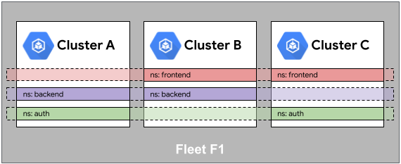 The fundamental example of sameness in a fleet is namespace sameness. Namespaces with the same name in different clusters are considered the same by many fleet features. Another way to think about this property is that a namespace is logically defined across an entire fleet, even if the instantiation of the namespace exists only in a subset of the fleet resources.
