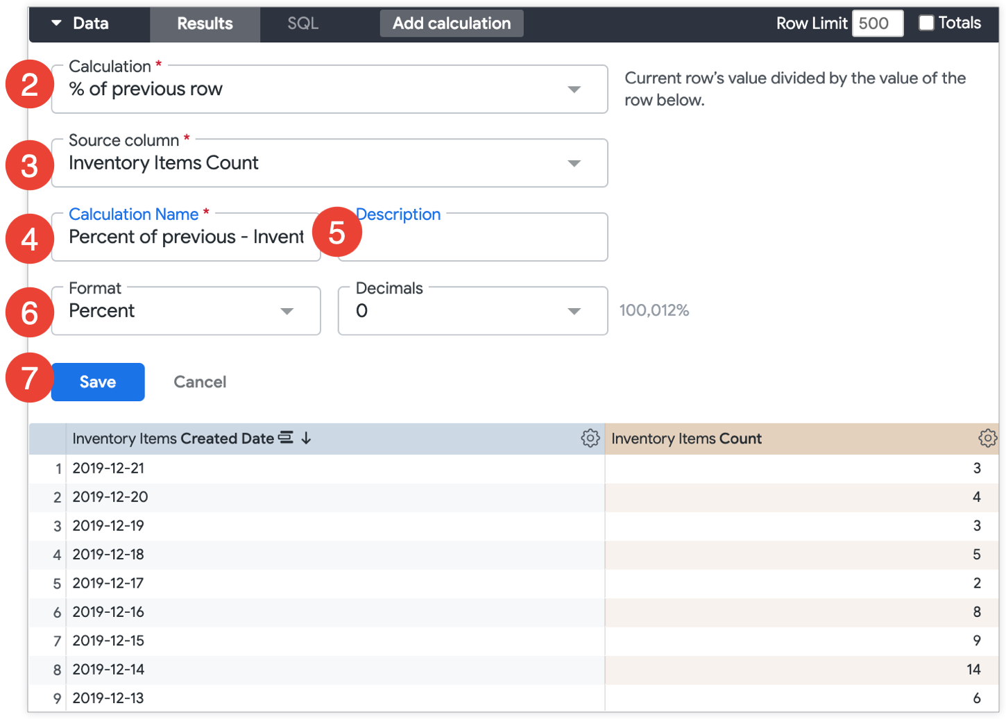 Select a calculation type from the Calculation drop-down. This example uses % of previous row to compare the count of inventory items with the previous month's count of inventory items.