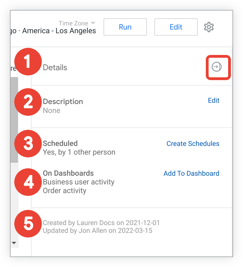 The Details panel on the right side of the Look page lets users quickly access additional details about a Look. Users can also use the Details panel to customize and use their Look in several ways, depending on their permissions, including: