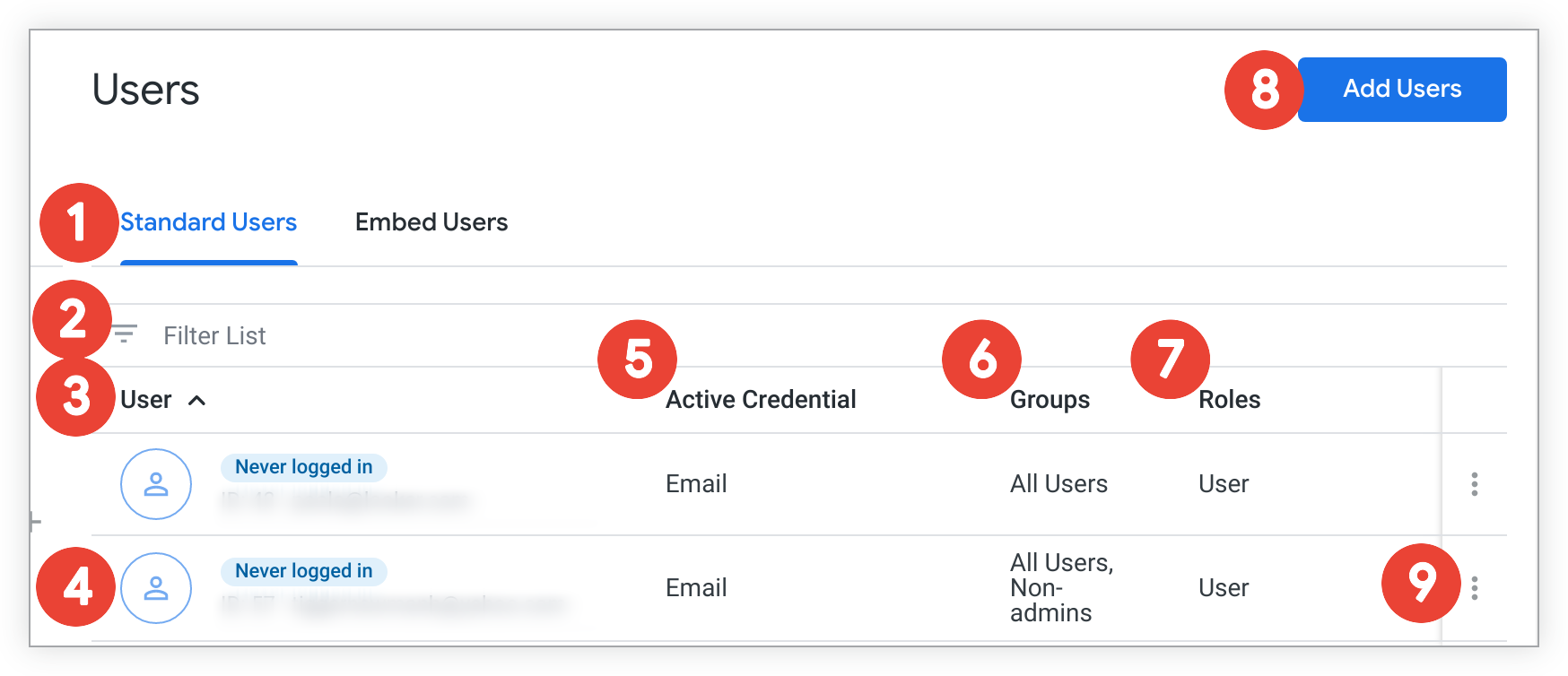 - The Standard Users tab shows users who sign in to Looker directly, through either the regular authentication process or through the Looker API.
